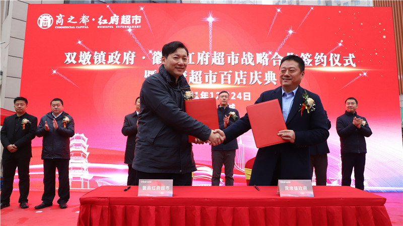 開業(yè)儀式前,雙墩鎮(zhèn)鎮(zhèn)長王世德與紅府超市董事長王正共同簽訂了戰(zhàn)略合作協(xié)議,雙方將聯(lián)手共同推動合作向縱深發(fā)展,紅府超市將在雙墩鎮(zhèn)打造更多的鎮(zhèn)企合作示范店并加快紅府雙墩農(nóng)業(yè)基地建設,為當?shù)鼐用駧砀啾憷蛯嵒荨?