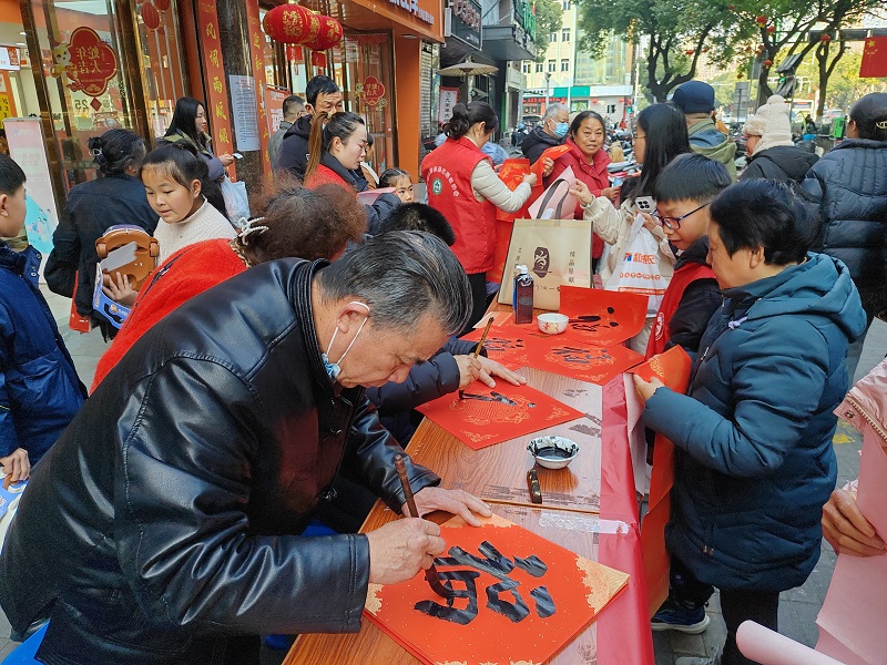 活動(dòng)現(xiàn)場墨香飄溢,“年味”十足?;顒?dòng)特別邀請(qǐng)了多位書法老師參加,他們揮毫潑墨,親手為來往顧客和社區(qū)居民寫下對(duì)新春祝福的大紅春聯(lián)和滿載福意的“福”字。大家有序排隊(duì),滿懷期待地接過墨寶,臉上洋溢著幸福的笑容。一幅幅春聯(lián),一個(gè)個(gè)“福”字,不僅傳遞著新年的祝福,更凝聚了社區(qū)鄰里的深厚情誼。