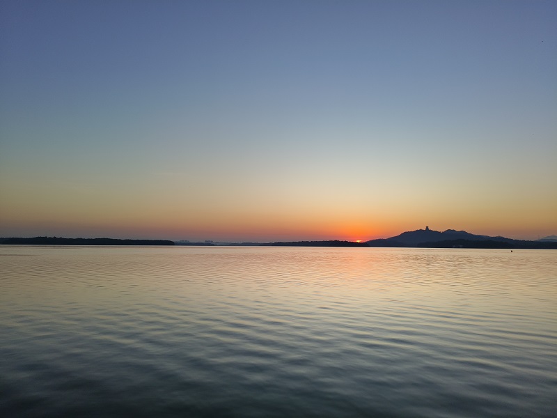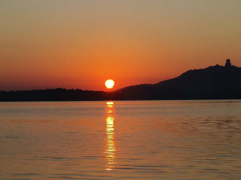 圖片描述:平天湖日出時,太陽從遠山后緩緩升起,將天空染成橙紅。湖面如鏡,倒映著金色光芒,水波輕漾,整個畫面靜謐又絢爛。